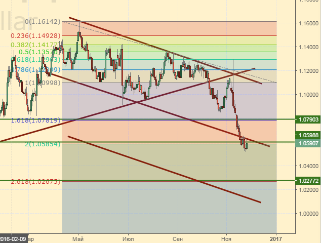 Сценарий роста:падение приостановилось, но быкам не удалось закрепиться выше 1.0600. Наши попытки сыграть на отскоке ни к чему не привели. Отскока не было. Мы пока не будем говорить о том, что это некий симптом бесконечной слабости евро но, если за следующие две недели – время до объявления очередного решения по ставке ФРС США (14.12.16), европейская валюта не сможет коснуться хотя бы 1.0800, перспективы достижения паритета станут еще более явными.
