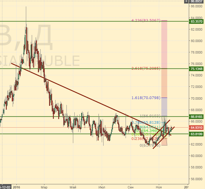 Сценарий роста: был посредине недели момент, когда понимание оставило меня. На самом деле правители то наши ждут 71 рубль в среднем за доллар в перспективе. Сейчас любые финты на укрепление рубля, т.е. пролом отметки 63.00, будут вызывать у ДАМа головную боль. Пока мы держимся выше 64.00 сценарии роста сохраняются. Не нервничаем. Сидим. Стоп все там же на 62.80.