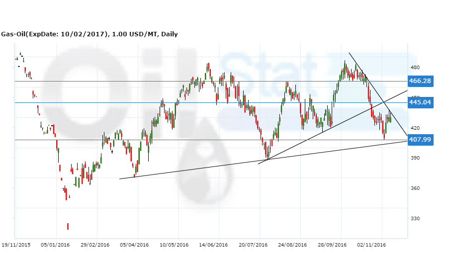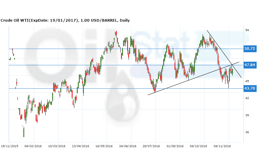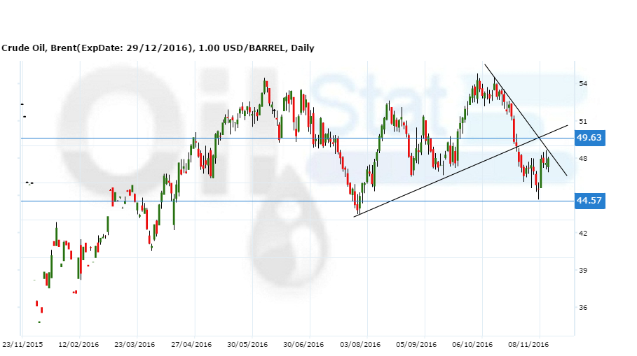 За неделю фьючерсы на нефть марки Brent показали рост на $2,11, или 4,5%, после снижения в последние четыре недели. На Нью-Йоркской товарной бирже нефть WTI с поставкой в декабре повысилась на 27 центов, или на 0,59%, завершив неделю на уровне $45,69 за баррель. В четверг цена контракта достигла $46,58, масимума с 1 ноября.