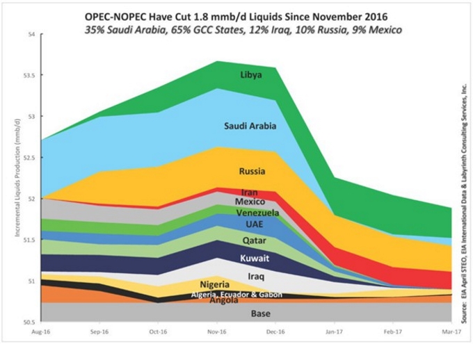 Саудовская Аравия сократила добычу на 619 тыс. баррелей в сутки (35% от общего объема), страны Совета сотрудничества стран Персидского залива, и Саудовская Аравия в том числе, сократили в целом 1159 тыс. баррелей в сутки (65% от общего объема). Ирак сократил производство нефти на 12% от общего объема соглашения, Россия — на 12%, Мексика — на 9%. Сокращение добычи нефти в Нигерии произошло непроизвольно, учитывая, что страна была освобождена от соглашения ОПЕК. Иран и Ливия были также освобождены от участия в соглашении, обе страны нарастили производство.