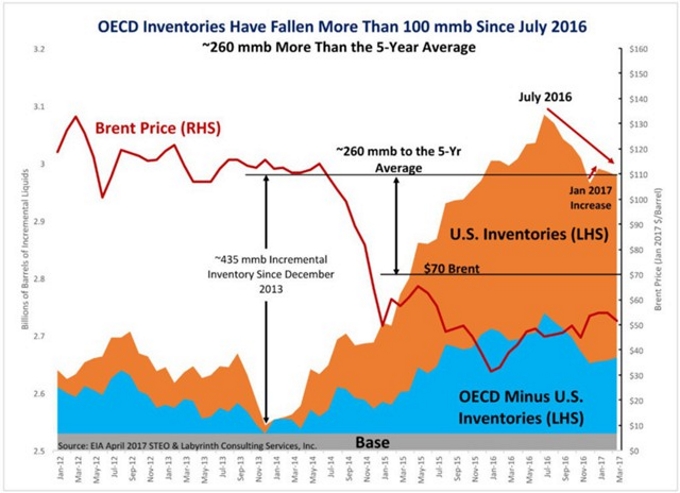 Запасы нефти стран ОЭСР начали падать в июле 2016 г., за четыре месяца до того, как было заключено соглашение о сокращении добычи ОПЕК. Уровень запасов упал примерно на 107 млн баррелей согласно данным EIA Steo. Сюда входит и увеличение запасов, зафиксированное в январе 2017 г., отмеченное в апрельском отчете МЭА.
