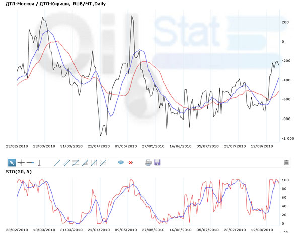 Спрэд ДТЛ-Москва / ДТЛ-Кириши на сегодня равен 244,55 руб. за тонну, сократившись недавно почти на 400 руб. за тонну. Стохастический индикатор находится в перекупленном положении и немного направлен вниз, предполагая, что скоро начнется его падение. Таким образом, разница по ДТЛ на этих двух базисах может увеличиться.