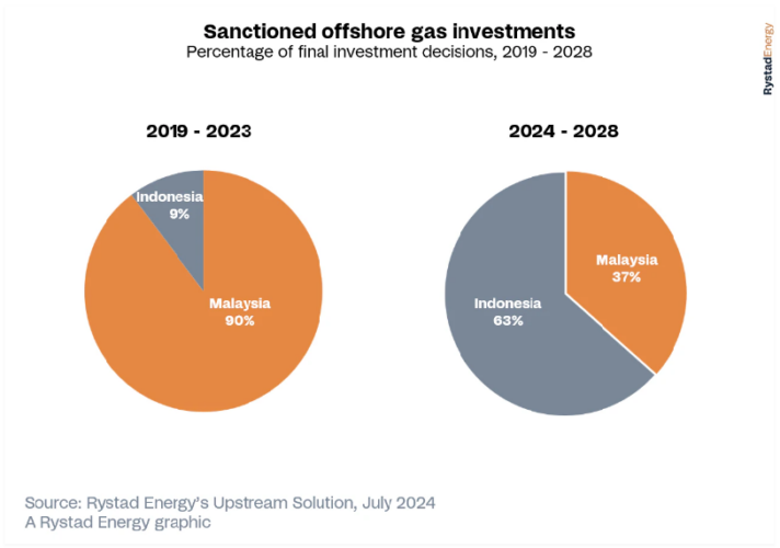 Если рассматривать только прогнозы по санкционированным инвестициям между двумя ведущими странами региона — Индонезией и Малайзией, то первая выделяется форсированием своей деятельности по добыче газа на шельфе. Этому способствуют такие крупные проекты, как Abadi LNG, реализуемый компанией Inpex, Indonesia Deepwater Development (IDD) компании Eni и Tangguh Ubadari Carbon Capture (UCC) компании BP. По прогнозам, на эти инициативы, а также на недавние открытия в провинциях Восточный Калимантан и Андаманские острова придется 75% от общего объема инвестиций в добычу газа на шельфе Индонезии, запланированных к реализации. Такой значительный рост делает Индонезию серьезным соперником Малайзии, несмотря на то, что Малайзия продолжает поддерживать высокий уровень активности благодаря недавним ОИР, успешной разведке и запланированным геологоразведочным работам.