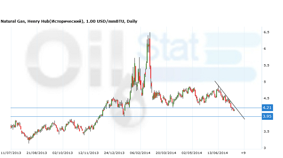 Поддержка – 3.95. Сопротивление — 4.21.Сценарий роста: цены пробились через поддержку на 4.21, ставшую затем сопротивлением. Быкам не стоит пока включаться в работу. Надо подождать пока рынок проявит себя ростом котировок. Когда это произойдет пока сказать сложно.