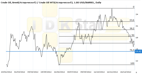 До конца текущей или в начале следующей недели спрэд Brent/WTI может протестировать отметку 14,42 долл./барр., что соответствует 76%-ному уровню Фибоначчи (отчасти в связи с предстоящим перекатом февральских фьючерсов WTI в мартовские; Brent уже торгуется в марте). Кроме того, как мы писали в своей Стратегии, ближайшей целью сужения спрэда Brent/WTI (на ближайшие неделю-полторы) мы видим отметку 13,01 долл. Следующей (месячной) целью видим уровень 10,89 долл.