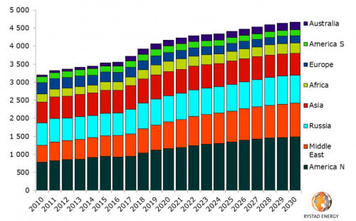 Rystad Energy прогнозирует, что уровень предложения на мировом рынке природного газа к 2030 году достигнет 4660 млрд. кубических метров. Больше всего производительность возрастет в Северной Америке, на Ближнем Востоке и в России.