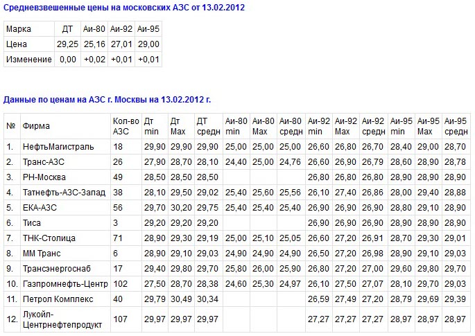 Средневзвешенные цены на московских АЗС с 6 по 13 февраля 2012 г. незначительно выросли и составили, по данным Московской топливной ассоциации: дизельное топливо — 29,25 рублей, Аи-80 — 25,16 рублей, Аи-92 – 27,01 рублей, Аи-95 – 29,00 рублей, пишет Аи92.