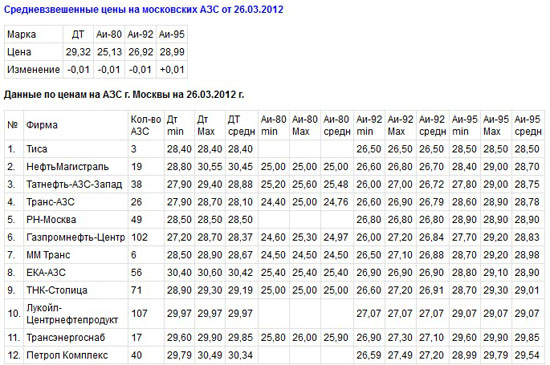 Средневзвешенные цены на московских АЗС с по 19 по 26 марта 2012 г. незначительно снизились и составили, по данным Московской топливной ассоциации: дизельное топливо — 29,32 рублей, Аи-80 — 25,13 рублей, Аи-92 – 26,92 рублей, Аи-95 – 28,99 рублей, пишет Аи92.