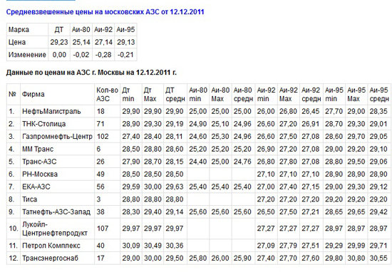 Средневзвешенные цены на московских АЗС с 5 по 12 декабря 2011 года снизились и составили, по данным Московской топливной ассоциации: дизельное топливо — 29,23 рублей, Аи-80 — 25,14 рублей, Аи-92 – 27,14 рублей, Аи-95 – 29,13 рублей, пишет Аи92.