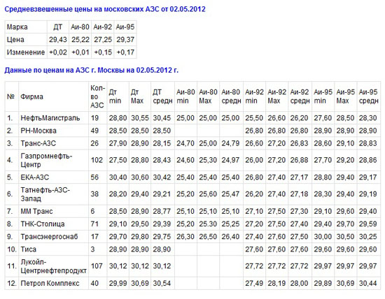 Средневзвешенные цены на московских АЗС с 23 апреля по 2 мая 2012 г. повысились и составили, по данным Московской топливной ассоциации: дизельное топливо — 29,43 рублей, Аи-80 — 25,22 рублей, Аи-92 – 27,25 рублей, Аи-95 – 29,37 рублей, пишет Аи92.