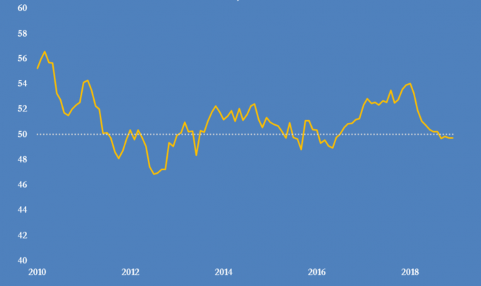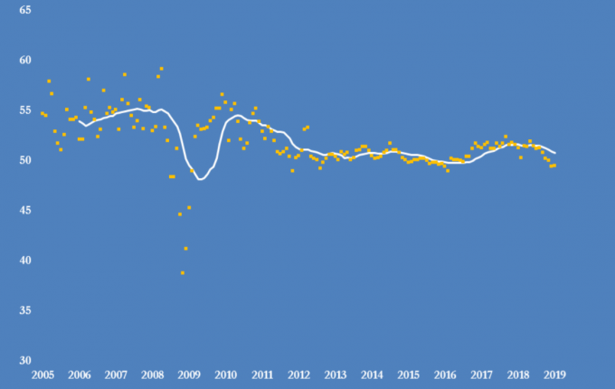 Рис. 1 Индекс PMI в Китае, 2005 — 2019 годы
