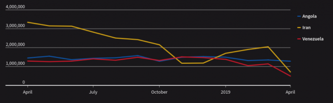 Ужесточение санкций против Ирана в мае — это ещё один фактор, влекущий сокращение объемов поставок тяжелых сортов нефти в мире и рост цен на них. Новые ограничения в отношении экспорта нефти в Иране были введены Вашингтоном в период действия санкций против венесуэльской нефтяной промышленности. Кроме того, существенные проблемы наблюдаются и в нефтяной промышленности Анголы.