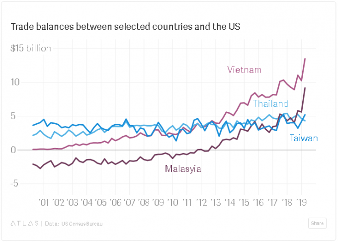 Как отметил Брэд Сетсер из Совета по международным отношениям, наибольшие выгоды получает Вьетнам, у которого резко увеличились объемы торговли с США. И пока представители Минфина США изучают ситуацию с точки зрения того, что Вьетнам искусственно девальвирует валюту, чтобы быть более конкурентоспособным на мировых рынках, Сетсер пришел к выводу, что «недавний скачок его профицита стал следствием тарифов Трампа на Китай».