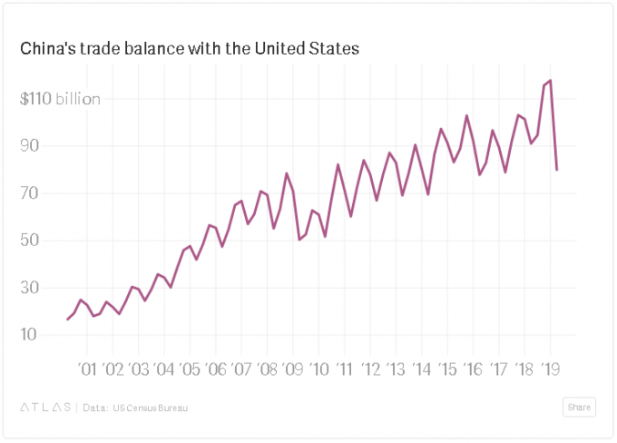 Трамп назвал торговый дефицит ключевым показателем в этой войне, хотя экономисты считают, что торговый баланс сам по себе нельзя назвать полезным показателем. Благодаря новым налогам, введенным администрацией Трампа американцам, которые покупают китайские товары, этот показатель упал. В марте 2019 г. США импортировали товары на $20 млрд больше, чем экспортировали в Китай. Это самый низкий уровень дефицита с марта 2014 г. В I квартале 2019 г. США закупили у Китая товаров и услуг на $80 млрд больше, чем экспортировали туда.