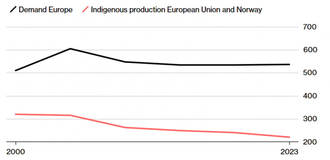 Рис. 2 Производство природного газа в Европе сокращается в свете стабильного спроса