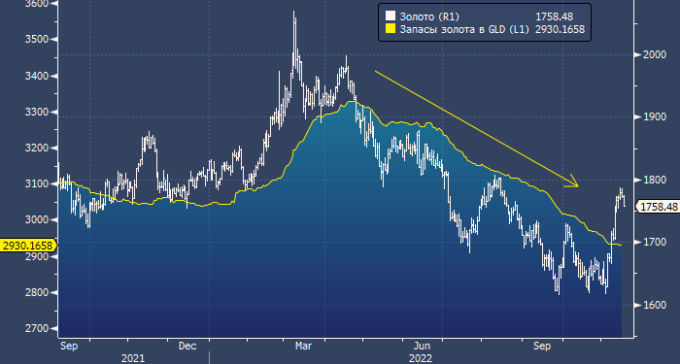 Золото имеет тенденцию показывать сильную динамику в периоды геополитической напряженности, однако сегодня более сильным фактором выступает быстрое повышение ставок со стороны ФРС. Впрочем, вскоре все может измениться: в начале ноября Goldman Sachs озвучил прогноз о том, что как только американский регулятор приступит к снижению ставок — вероятно, это произойдет на фоне рецессии — цена золота вырастет на 20–30%.