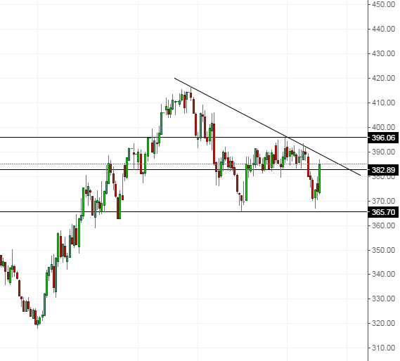 Сценарий роста:неплохой отскок от 365.00. Теперь задача, взять линию сопротивления, нивелировать коррекционное движение и отправиться к 500.00. А почему нет.Для покупок можно использовать любые откаты на 10 — 15 долларов.
