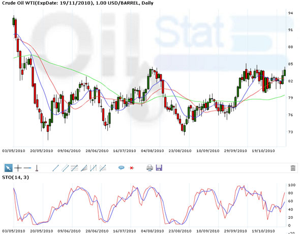 Цены на нефтяные фьючерсы Light Sweet и Brent повысились с начала дня более чем на 0,5%. Так, по состоянию на 15:20 стоимость декабрьских фьючерсов на нефть WTI (Light Sweet Crude Oil) на электронных торгах в Нью-Йорке повысилась на $1,05 и составила $84,95 за баррель, а спотовая цена на нефть марки Brent поднялась на $1,10 до $86,51 за баррель.