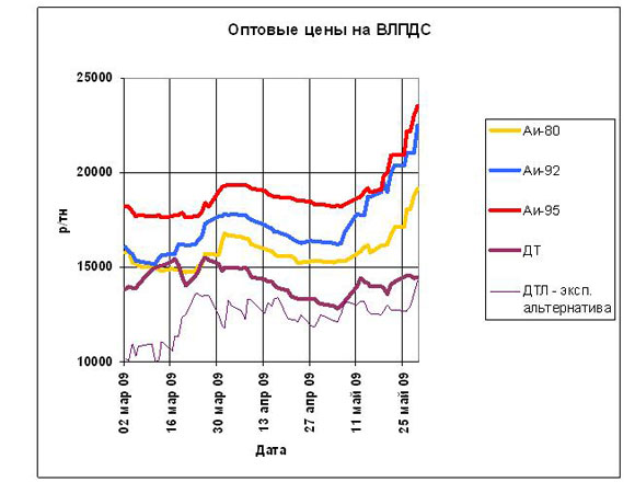 Взрыв внутренних цен произошел в мае. Именно в это время, как никогда, оживает сезонный спрос на бензины, постегивающий оптовые цены. К естественному в таких условиях росту бензиновых цен добавляется и так называемая составляющая от выпадающих доходов нефтяников, заморозивших цены на ДТ для аграриев. К примеру, в мае 2009 года оптовые цены на бензины дали рекордную прибавку – от 25% до 37%, а дизельное топливо прибавило в цене только (10-11)%.