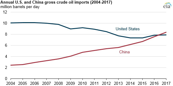Импорт сырой нефти США и КНР с 2004 по 2017 год. Источник: US Energy Information Administration