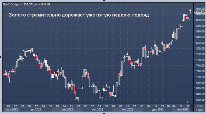 Спотовое золото подешевело на 0,1% до $1928,98 за унцию к 11:48 по Гринвичу, после роста до самого высокого уровня с 22 апреля прошлого года на уровне $1937,49 ранее в ходе сессии. На этой неделе цены выросли на 0,5%. Фьючерсы на золото в США выросли на 0,3% до 1 929,70 доллара.