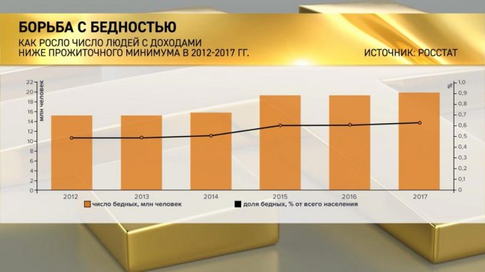 Ю.П.: Я пойду сейчас на обострение. У меня есть несколько наглядных цифр. Борьба с бедностью. В указе четвертый пункт. Задача серьезная – снижение в два раза уровня бедности. Сейчас на графике вы видите, как росло число людей с доходом ниже прожиточного минимума за период с 2012 по 2017 год. Вот это их успех.Я специально наглядно показываю в цифрах. Дальше идем. Что происходило с доходами населения? То есть можно по-разному оценивать, но я соглашусь с господином Глазьевым, нынешняя макроэкономическая, денежно-кредитная, социально-экономическая политика обанкротилась. Меня крайне настораживает продвижение Антона Силуанова, который, кстати, и воплощает как оператор, профессионал своего дела, бухгалтерский подход. Смотрите, что происходило с доходами населения, анализируем два последних года, 2017-2018, оценка, динамика реальных денежных доходов к аналогичному периоду прошлого года. Наглядно? Вы все видите. Это все данные Росстата, официальные данные.
