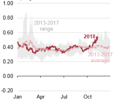 Для сравнения — маржа производства дизеля в New York Harbor в первой половине 2018 года составила, в среднем, 38 центов за галлон, в октябре возросла до 40 центов за галлон, а в ноябре — до 50 центов за галлон.