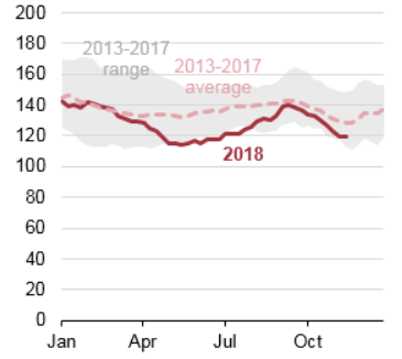 В течение первых трех недель ноября месячный объем потребления бензина составил, в среднем, 9.2 млн. баррелей в день. Это на 262,000 баррелей в день меньше, чем в ноябре 2017 года. Вместе с тем, в течение первых трех недель ноября объемы поставок дистиллятного топлива возросли на 216,000 баррелей в день. Этому способствовало увеличение транспортировок по морю и на грузовиках.