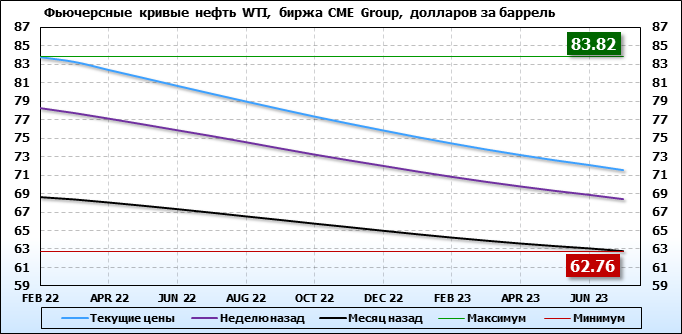 На 17.01.22 стоимость нефти марки WTI на бирже CME Group по контракту FEB 22 составила 83.82 доллара за баррель. За прошедшую неделю стоимость нефти марки WTI выросла на 5.59 $/баррель. Как мы видим на графике, фьючерсная кривая имеет периоды, когда более дальний фьючерс дешевле ближнего. Состояние бэквардации наблюдаем на следующих контрактах: MAR 22; APR 22; MAY 22; JUN 22; JLY 22; AUG 22; SEP 22; OCT 22; NOV 22; DEC 22; JAN 23; FEB 23; MAR 23; APR 23; MAY 23; JUN 23; JLY 23. Таким образом, трейдеры предполагают, что возможно превалирование предложения над спросом в указанные периоды, если рынок будет находиться на данных ценовых уровнях.