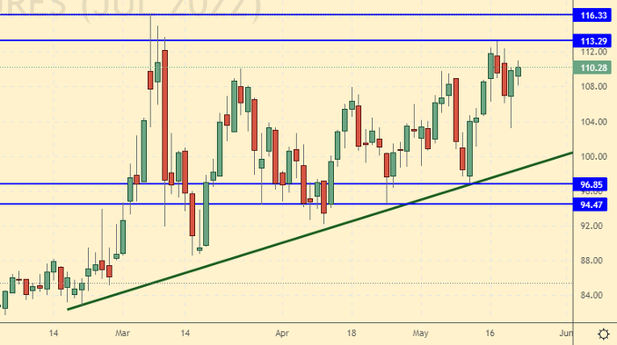 Сценарий роста: рассматриваем майский фьючерс, дата экспирации 31 мая. Будем держать лонги. Желающие смогут добавить после роста выше 116.00.