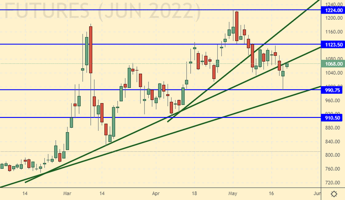 Сценарий падения: войдем в шорт после снижения ниже 1050.0. Шансы на коррекцию хорошие, так как страхи по поводу дефицита зерна значительно снизились.