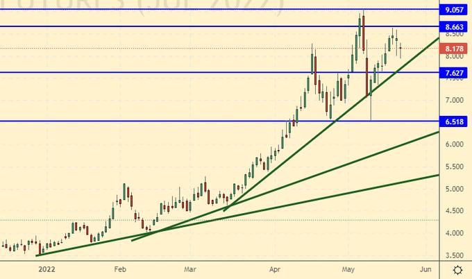 В случае проблем с погодой и снижения урожайности можно ожидать резкой реакции со стороны рынков. По пшенице уровень 1400 центов за бушель остается в поле зрения. По кукурузе мы способны сходить к уровню 870 центов за бушель. Эти движения вверх могут состояться как в июне, так и в более поздние периоды времени. Многое будет зависеть от расхождения текущих, в целом положительных ожиданий рынка по валовому сбору, и фактической картины. Выше названных отметок рынок не просматривается, так как дальше начнется просто падение спроса из-за банального голода в ряде стран, так как люди не смогут позволить себе хлеб по утроившейся, по сравнению с прошлым годом, цене.
