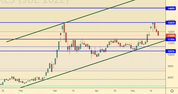 Сценарий роста: рассматриваем июльский фьючерс, дата экспирации 21 июня. Будем держать открытые на прошлой неделе лонги. В случае прорыва выше 117.00 можно добавить.