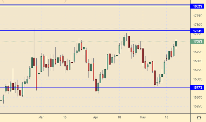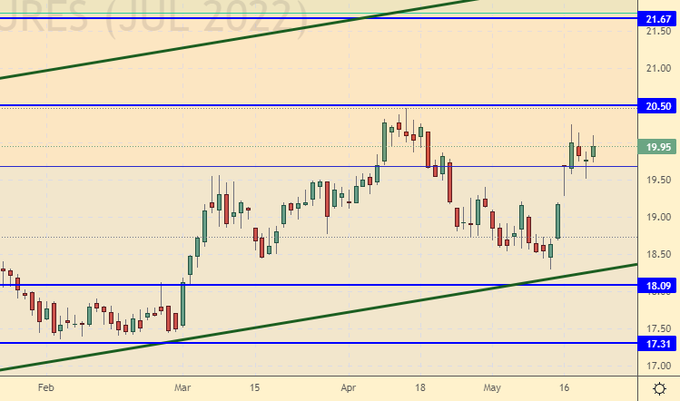 Сценарий роста: рассматриваем июльский фьючерс, дата экспирации 30 июня. Мы идем к 21.60. Более сильный рост пока не просматривается.
