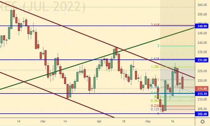 Сценарий падения: пока от продаж воздержимся. Если рынок упадет ниже 210.0 снова будем думать о входе в шорт.