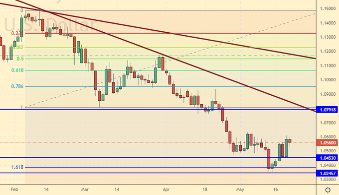 Сценарий роста: российский рынок акций пытался расти на ожиданиях дивидендов от Газпрома. Но вряд ли компания даст инвесторам аж по 50 рублей на акцию как того ждут обыватели. И 10 рублей хватит. Совет директоров пройдет 26-го мая. В рост не верим. Вне рынка.