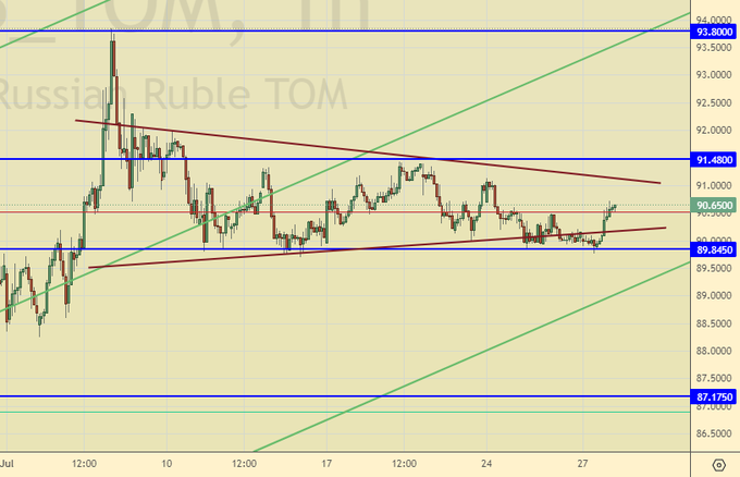 Рынок не может уйти ниже 90.00, при этом, его в случае прохода ниже данного уровня вытаскивают вверх, что делает ситуацию более бычьей, чем сутки назад. Просматривается регулирование. В случае роста выше 91.55 можно заходить в покупку.