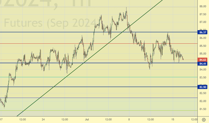 Если мы сегодня и завтра не опустимся ниже 84.00, то это может привести к сильному ходу вверх. При более размеренном развитии событий нас ждет откат к 83.00, возможно к 80.00.