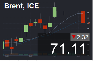 Цена в долларах за баррель. Для пересчета в доллары за тонну нефти марки Brent, необходимо цену умножить на 7,59.