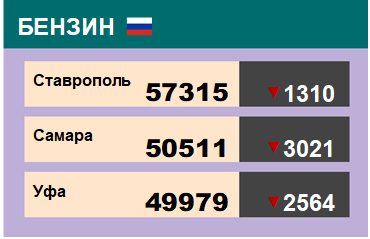 По данным Росстата на 16 апреля цена литра бензина марки АИ-92 дошла до 38 рублей 30 копеек, на АИ-95 — до 41 рубля 31 копейки, и АИ-98 — до 46 рублей 62 копеек. Рост стоимости топлива наблюдался практически во всех субъектах Российской Федерации. Больше всего он ударил по карману жителей Саранска и Сыктывкара — там подорожание составило 1,0%. В Симферополе ценники на бензин подскочили на 0,9%, в Астрахани, Нижнем Новгороде, Нальчике и Пензе — на 0,8%.