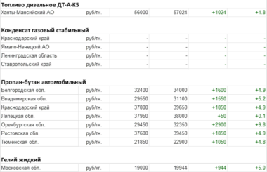 За прошедшую неделю в результате торгов на площадке eOil.ru были показаны следующие результаты электронных аукционов: цены на бензин неэтилированный АИ-95-К5, базис поставки Ханты-Мансийский АО, выросли за неделю на 561 рубль до 62578 рублей за тонну. Цены на бензин неэтилированный АИ-92-К5, базис поставки Ханты-Мансийский АО, выросли за неделю на 1284 рубля до 55304 рублей за тонну. Цены на топливо дизельное ДТ-А-К5, базис поставки Ханты-Мансийский АО, выросли за неделю на 389 рублей до 56557 рублей за тонну. Цены на пропан-бутан автомобильный, базис поставки Тюменская область, выросли за неделю на 1636 рублей до 22500 рублей за тонну. Цены на гелий газообразный, базис поставки Оренбургская область, выросли за неделю на 394 рубля до 3301 рубля за кубический метр. |