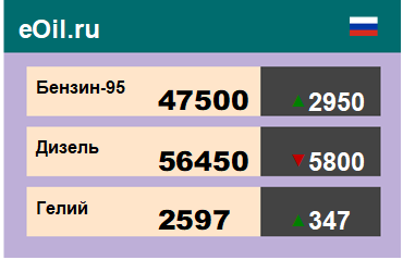 За прошедшую неделю в результате торгов на площадке eOil.ru были показаны следующие результаты электронных аукционов: цены на бензин неэтилированный АИ-95-К5, базис поставки Ханты-Мансийский АО, выросли за неделю на 2950 рублей до 47500 рублей за тонну. Цены на бензин неэтилированный АИ-92-К5, базис поставки Ханты-Мансийский АО, выросли за неделю на 1250 рублей до 42000 рублей за тонну. Цены на топливо дизельное ДТ-А-К5, базис поставки Ханты-Мансийский АО, снизились за неделю на 5800 рублей до 56450 рублей за тонну. Цены на пропан-бутан автомобильный, базис поставки Тюменская область, снизились за неделю на 350 рублей до 3050 рублей за тонну. Цены на гелий газообразный, базис поставки Оренбургская область, выросли за неделю на 347 рублей до 2597 рублей за кубический метр. |