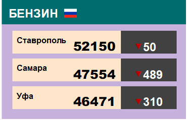 Потребительские цены на бензин в среднем по России с 15 по 21 апреля 2019 года не изменились (пятую неделю подряд) в процентном соотношении к предыдущему отчетному периоду, следует из материалов Федеральной службы государственной статистики. При этом ведомство указывает, что к 22 апреля средняя потребительская стоимость 1 литра бензина осталась на прежнем уровне в 43,97 рубля, в сравнении с данными на 15 апреля. Росстат отмечает, что в среднем по стране стоимость бензина АИ-92 не изменилась — 41,66 рубля. Цена бензина марки АИ-95 также осталась на прежнем уровне — 44,98 рубля. Однако бензин марки АИ-98 подорожал на 2 копейки до 50,72 рубля. |