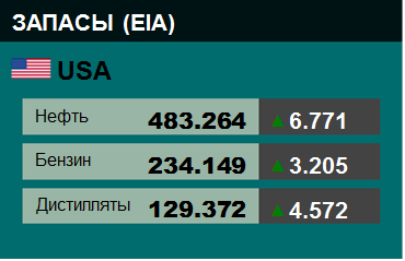 Нефть дешевеет после публикации данных о запасах энергоносителей в США, указавших на менее значительное, чем ожидалось, снижение запасов нефти на прошлой неделе. Стоимость июльских фьючерсов на нефть Brent на лондонской бирже ICE Futures к 18:20 по московскому времени в четверг составила $68,34 за баррель, что на $1,1 (1,6%) ниже уровня предыдущей сессии. Фьючерсы на нефть WTI на июль на Нью-йоркской товарной бирже (NYMEX) подешевели к этому времени на $0,64 (1,09%) — до $58,17 за баррель. Добыча нефти выросла на 0.1 до 12.3 млн. баррелей в день. Импорт нефти упал на -0.081 до 6.862 млн. баррелей в день. Экспорт нефти вырос на 0.395 до 3.317 млн. баррелей в день. Таким образом, чистый импорт нефти упал на -0.476 до 3.545 млн. баррелей в день. Переработка нефти выросла на 1.3 до 91.2 процента. |