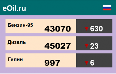 За прошедшую неделю в результате торгов на площадке eOil.ru были показаны следующие ценовые изменения: Цены на бензин неэтилированный АИ-95-К5, базис поставки Ханты-Мансийский а.о., упали за неделю на 430 рублей до 43070 рублей за тонну. Цены на бензин неэтилированный АИ-92-К5, базис поставки Ханты-Мансийский а.о., выросли за неделю на 625 рублей до 41000 рублей за тонну. Цены на топливо дизельное ДТ-А-К5, базис поставки Ханты-Мансийский а.о., упали за неделю на 16 рублей до 45027 рублей за тонну. Цены на пропан-бутан автомобильный, базис поставки Тюменская область, упали за неделю на 100 рублей до 6500 рублей за тонну. Цены на гелий газообразный, базис поставки Оренбургская область, упали за неделю на 6 рублей до 997 рублей за кубический метр.
