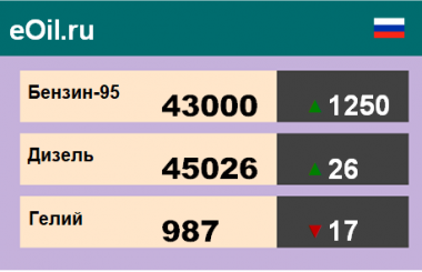 За прошедшую торговую сессию в результате торгов на площадке eOil.ru были показаны следующие ценовые изменения: Цены на бензин неэтилированный АИ-95-К5, базис поставки Ханты-Мансийский а.о., упали в течение дня на 1250 рублей до 40550 рублей за тонну. Цены на бензин неэтилированный АИ-92-К5, базис поставки Ханты-Мансийский а.о., упали в течение дня на 825 рублей до 39125 рублей за тонну. Цены на топливо дизельное ДТ-А-К5, базис поставки Ханты-Мансийский а.о., упали в течение дня на 650 рублей до 45150 рублей за тонну. Цены на пропан-бутан автомобильный, базис поставки Тюменская область, упали в течение дня на 350 рублей до 5750 рублей за тонну. Цены на гелий газообразный, базис поставки Оренбургская область, упали в течение дня на 39 рублей до 1022 рублей за тонну.