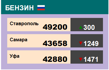 За первую неделю июля цены на бензин не изменились. При этом стоимость дизельного топлива также осталась на прежнем уровне, сообщает ведомство. Рост цен на бензин прекратился после роста на 0,1 процентного пункта в течение трёх недель. Снижение цен на бензин за отчётный период наблюдалось в трёх региональных центрах — в Нальчике — на 0,2%, в Южно-Сахалинске и Петрозаводске — на 0,1%. В то же время бензин дорожал в 15 региональных центрах. В Иркутске он вырос в цене на 1,3%. В Москве за прошедшую неделю цены на бензин автомобильный не изменились, в Санкт-Петербурге — увеличились на 0,1%. |