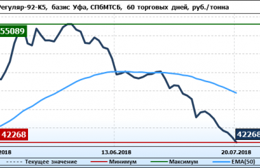 Средние потребительские цены на бензин в России за период с 23 по 29 июля 2018 г. снизились на две копейки, сообщил Росстат. В частности, бензин марки Аи-92 подешевел на две копейки, до 41,51 руб. за литр, Аи-95 — на одну копейку, до 44,58 руб. за литр, а бензин Аи-98 стал дешевле на 2 копейки, до 49,82 руб. за литр. Дизельное топливо подешевело на одну копейку, до 44,46 руб. за л. За прошедшую неделю снижение цен на бензин отмечалось в 20 центрах субъектов России. Более всего цены на него снизились в Назрани — на 1,9%, Севастополе — на 0,7%, Оренбурге и Симферополе — на 0,5%.