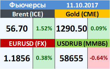 Нефть: ждем выхода данных по запасам API сегодня в 23.30 и EIA уже завтра в 18.30. Как видим, на этой неделе сдвиг по выходу данных на один день из-за праздника День Колумба (9 октября). Вместо вторника и среды, данные по запасам будут выходить в среду и четверг. Если изменения будут незначительными до плюс – минус пять млн. баррелей, то рынок продолжит находиться в среднесрочном растущем тренде. Золото: после отскока от 1260 уже хочется увидеть коррекцию. Но КНДР, Иран, а теперь и Турция, закрывшая въезд в страну всем гражданам США, не добавляют оптимизма. Спекулянтам нужен откат, чтобы купить подешевле. Евро: глава Каталонии Карлес Пучдемон помявшись на трибуне не стал призывать к радикальным мерам, не смотря на результаты референдума. На этом фоне евро прибавил еще половину цента. Но европейский парад суверенитетов не закончен. В эти выходные выборы в Австрии, где ждут усиления влияния ультраправых. Рубль: рубль вчера окреп. С начала сессии график дернулся вниз, да так и остался под отметкой 58.00, едва приподнявшись от минимумов. Рынок пока выбирает стабильность и легкие метания в диапазоне, однако напряженность сохраняется. Если бы не черный фон в виде ослабления национальной валюты до 80 рублей за доллар двумя годами ранее, мы бы уже давно увидели бы 55.00. А так, уже сейчас рубль выглядит перекупленным.