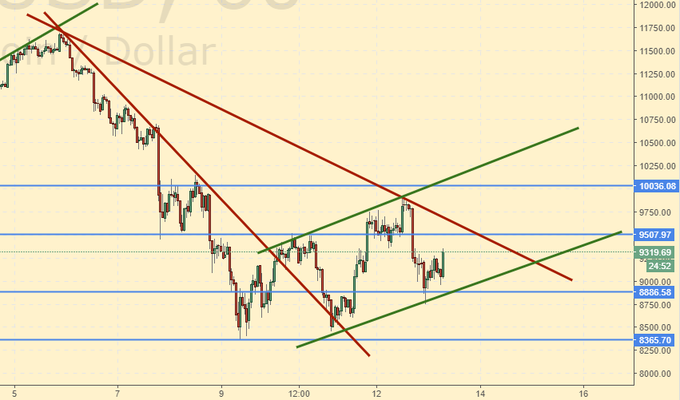 Продолжается борьба за уровень 10000. Пока мы видим, что находится достаточно много желающих продать биткоины при подходе к данному уровню. Радует, однако, уже то, что рынок не склонен к панике и продолжает держаться. То есть, какой-то анализ в головах людей все же проходит, и определенные надежды на рост цен сохраняется. Пока не покупаем.